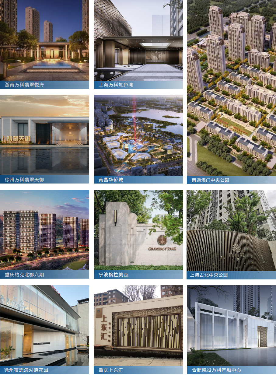 浙南萬科翡翠悅府、浙南萬科古翠隱秀、南通海門中央公園、徐州萬科翡翠天御、徐州萬科翡翠之光、徐州宿遷濱河道花園、南昌華僑城、重慶上東匯、重慶約克北郡六期、寧波格拉美西、上海萬科虹廬灣、上海古北中央公園、南京溧水未來城、合肥皖投萬科產融中心、溫州萬科大都會、溫州萬科星匯里等。
