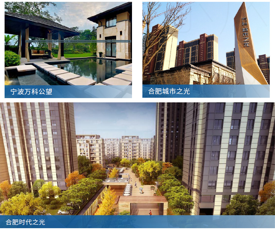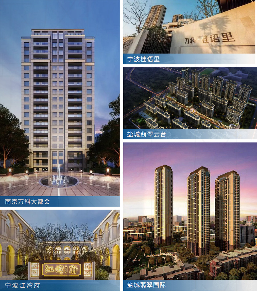 寧波桂語里、寧波萬科公望、寧波官山望、寧波望廬、寧波公園里二期、寧波江灣府、寧波萬科城五期、合肥城市之光、合肥時代之光、南京萬科大都會、鹽城翡翠云臺、鹽城翡翠國際等。