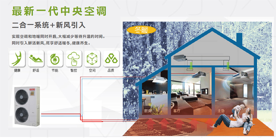 空氣源熱泵兩聯供機組,又稱地暖空調一體機,是將空調的功能及地暖的功能集成在一個主機系統上的機組。空氣源熱泵的主機,冬天的時候產生不超過 55℃的熱水,為房間提供地暖加熱。夏天同樣能用這臺主機制冷,會生產出符合條件溫度的冷卻水(天水地水)或者低溫低壓的冷媒氣液混合體(天氟地水),在風機盤管進行熱交換,將冷氣吹出來調節室內溫度。2020 年 6 月 22 日,首個《空氣源熱泵冷暖兩聯供舒適節能白皮書》在中國南京 發布,這將進一步促進空氣源熱泵兩聯供行業的發展,為國家節能減排“碳中和”“碳 達峰”目標添磚加瓦!